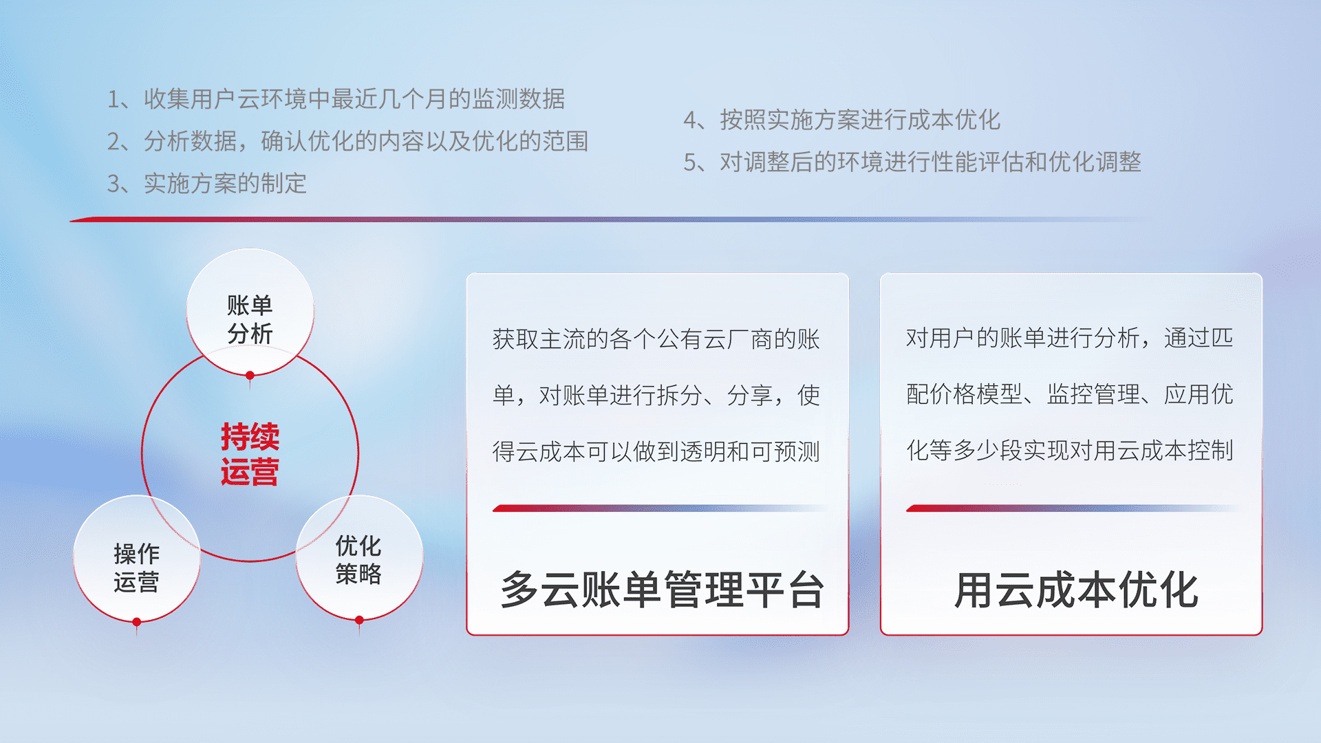 通过多云纳管,,,,以统一的资源数据模型把客户的云资源进行抽象和封装,,,,进而实现对多云资源的统一操作,,,保障云资源管理的可靠性、、、、稳定性与可用性。。量身定制化运维内容,,配置、、、开发运维、、、补丁管理、、、、备份、、、监控、、、认证和访问管理、、、审计和日常巡检等,,保障在用云过程中的可靠度,,,,稳定度以及高可用率。。